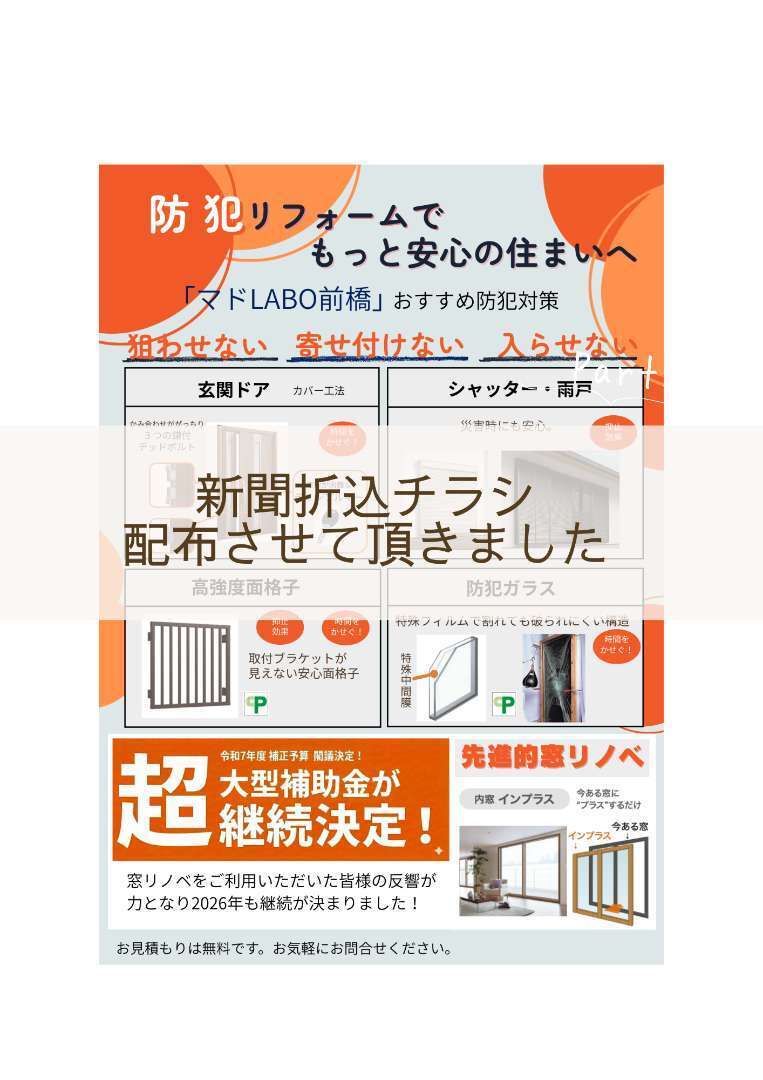 マドLABO前橋 周辺地域の皆様に「防犯リフォーム」の新聞折込チラシを配布させていただきました。