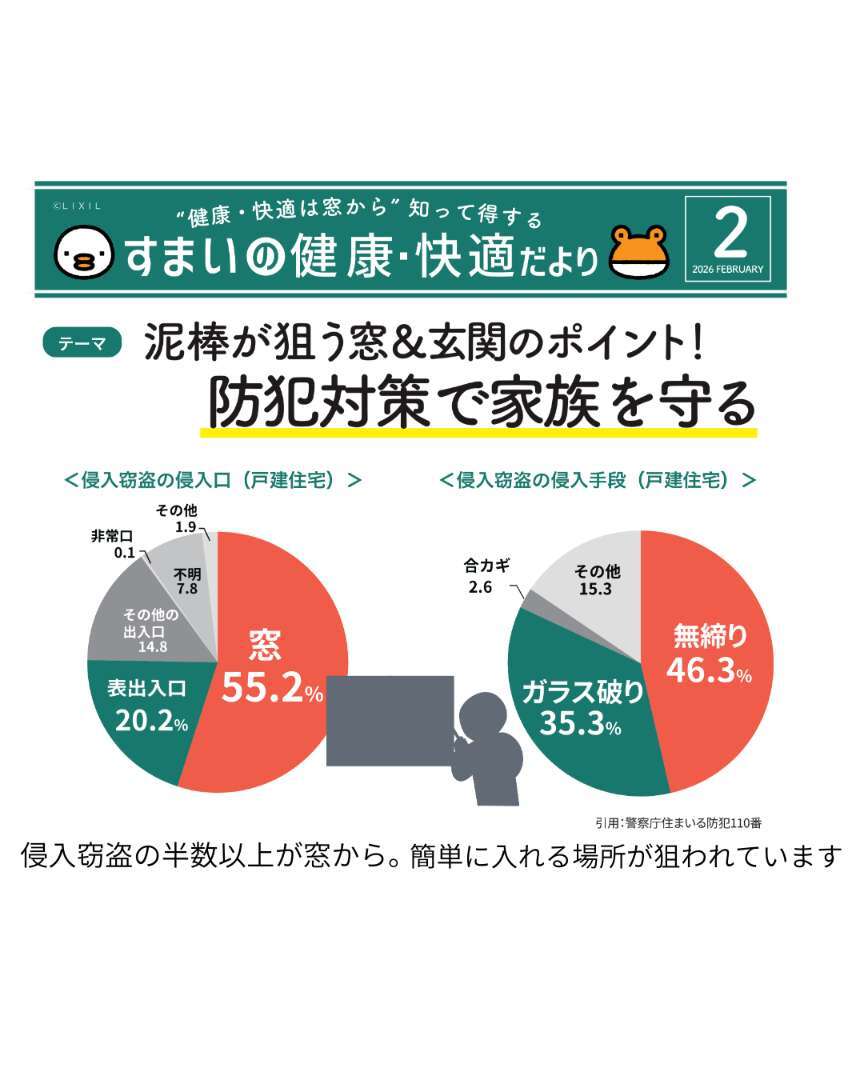 侵入窃盗は特別な家だけが狙われるわけではなく、「入りやすそうな窓や玄関」が狙われやすいと言われています。