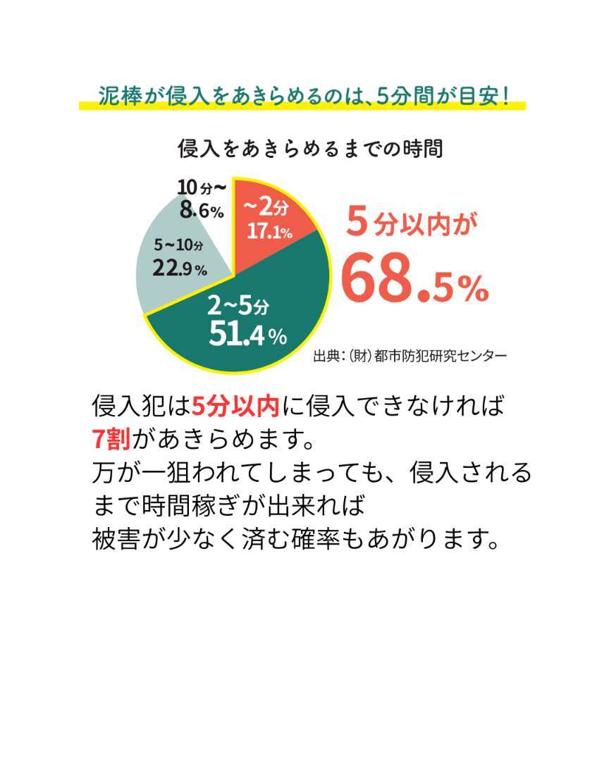侵入に5分以上かかると、約7割が犯行をあきらめると言われています。