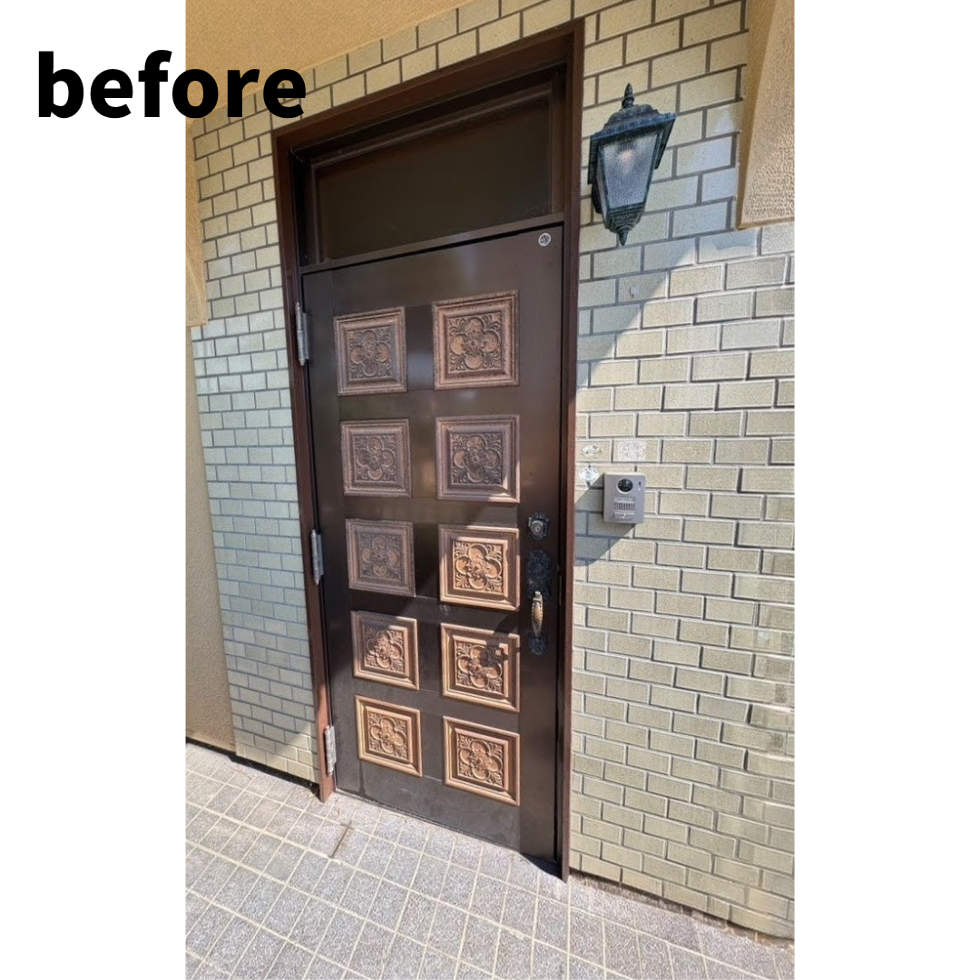 今回ご紹介するのは、長年お使いだった玄関ドアを LIXIL リシェント玄関ドアK2 D77型片開き・ランマ付きタイプ へ交換した施工事例です。